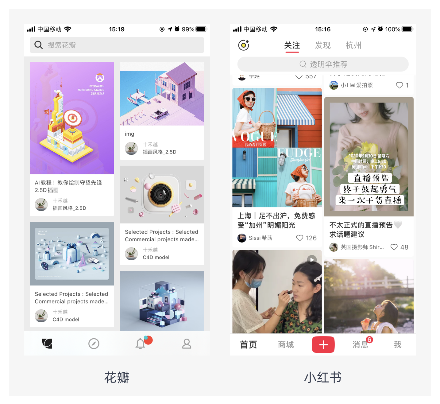 瀑布流式布局的視覺(jué)表現(xiàn)為參差不齊的多欄布局,用戶的視線軌跡以 Z 型為主,這種軌跡易于閱讀。但由于用戶采用 “就近原則” 閱讀信息,容易產(chǎn)生漏讀現(xiàn)象。它適用于社區(qū)類瀏覽型頁(yè)面,這類頁(yè)面往往信息量大,采用瀑布流式布局能讓瀏覽體驗(yàn)更為流暢,如花瓣、小紅書等平臺(tái),用戶可以不斷下拉獲取更多內(nèi)容,沉浸在瀏覽過(guò)程中。