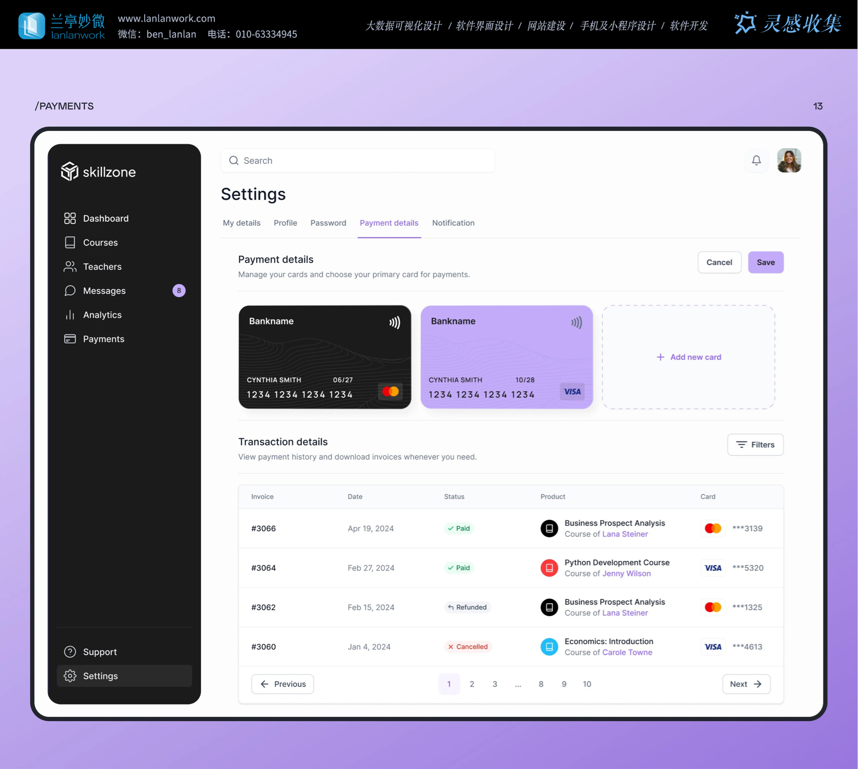 Skillzone 選用柔和的紫色為主色調(diào),紫色常給人智慧、有創(chuàng)造力的的感覺(jué),很符合教育的特點(diǎn)。再搭配簡(jiǎn)潔的黑白