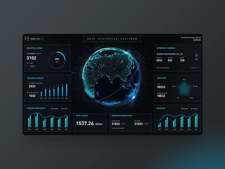 企業(yè)數(shù)據(jù)往往枯燥且復雜,而這類設計卻讓數(shù)據(jù) “活” 了起來。深色背景與熒光色、科技藍的碰撞,既拉滿科技氛圍,又通過色彩區(qū)分數(shù)據(jù)維度,讓層級一目了然。環(huán)形圖、折線圖等可視化組件,把營收、用戶增長等數(shù)據(jù)動態(tài)展示,仿佛數(shù)據(jù)在 “講述” 企業(yè)故事。這讓我們思考:數(shù)據(jù)類 UI 不該只是 “數(shù)據(jù)的容器”,更應是 “數(shù)據(jù)的翻譯官”,蘭亭妙微在做類似設計時,也會努力讓專業(yè)數(shù)據(jù)變得更易感知、更能輔助決策。