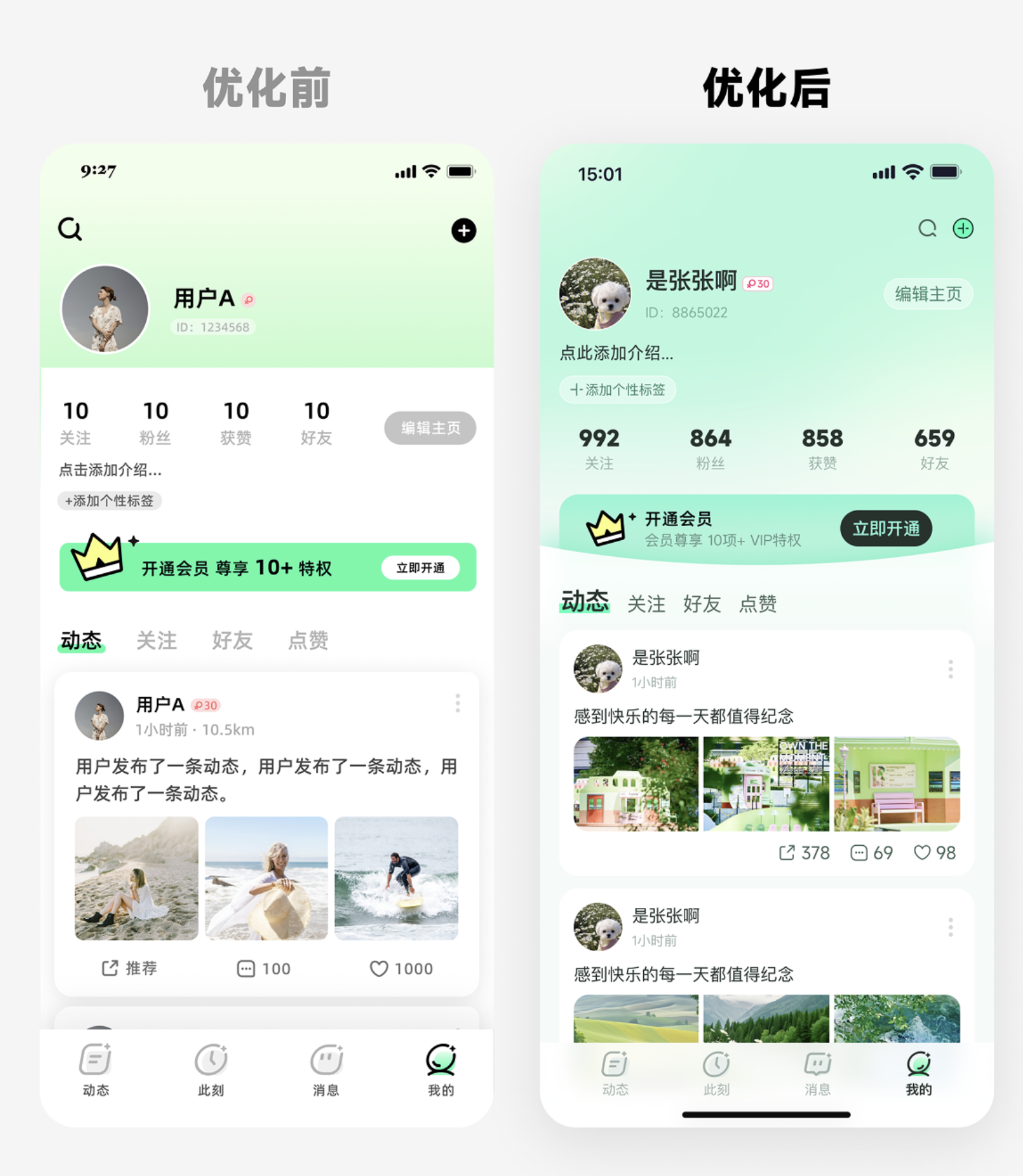 - 輕分割:用淺灰色背景分割不同的動態(tài)卡片,替代之前厚重的投影 —— 既區(qū)分了模塊,又不會讓頁面顯得 “笨重”;