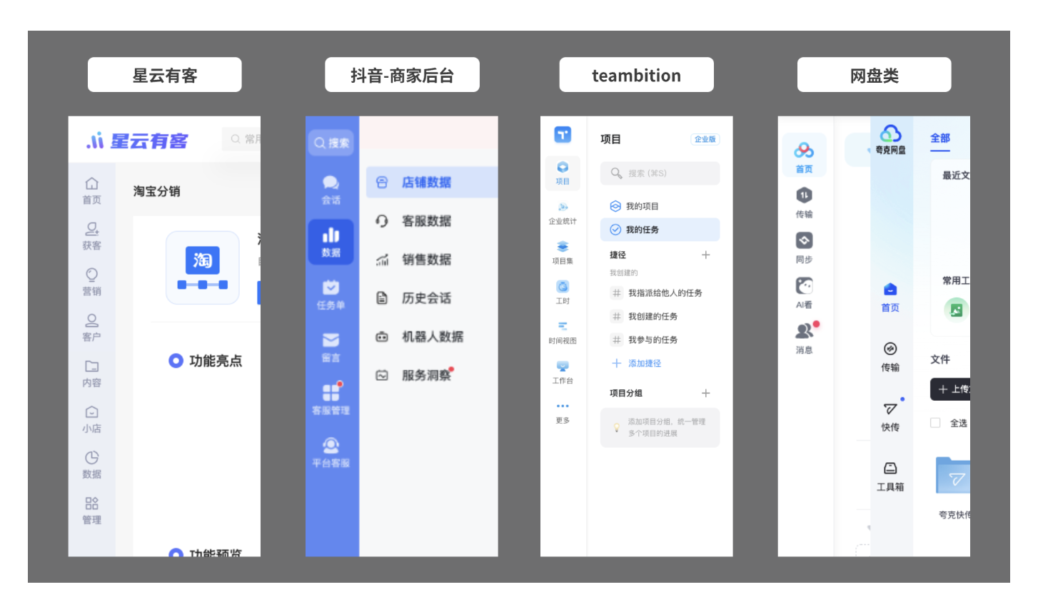 - 細欄(垂直導航):以圖標為核心,文字輔助說明,適用于模塊較少、需最大化展示內(nèi)容區(qū)域的場景,如網(wǎng)盤類產(chǎn)品、輕量型工具后臺。優(yōu)勢是簡潔高效,能減少導航對核心工作區(qū)的占用,但要求用戶對圖標含義有較高認知度,典型案例包括夸克網(wǎng)盤、Teambition 企業(yè)版。