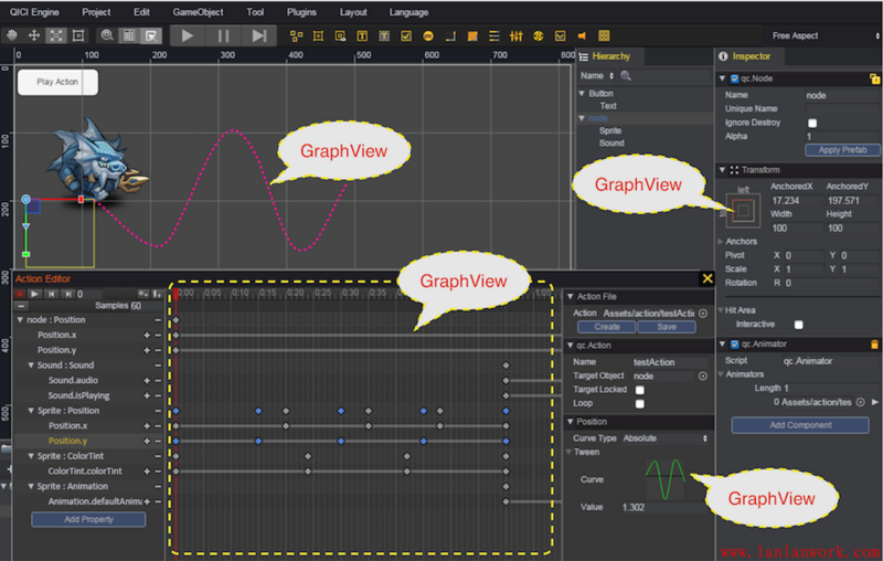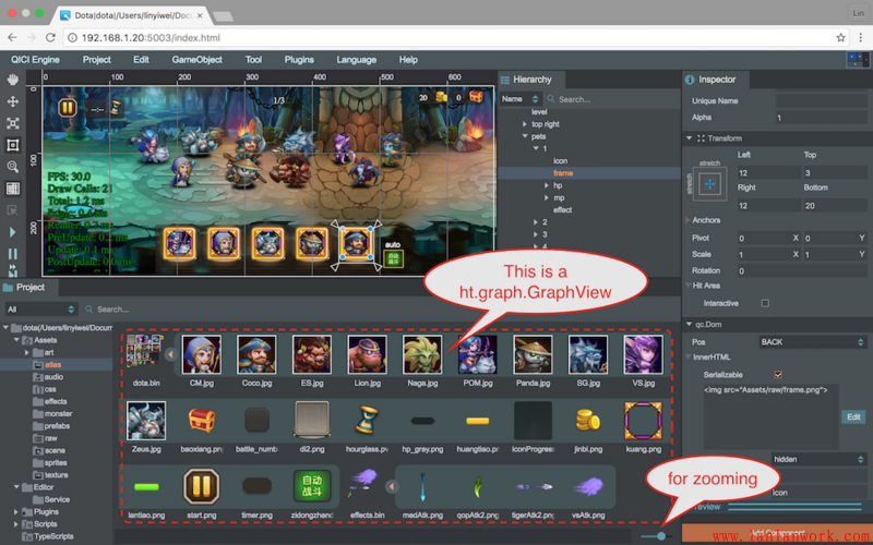 整個(gè) QICI Engine 的 HTML5 游戲引擎編輯工具就是基于 HT 組件定制開(kāi)發(fā)出來(lái)的,上圖刀塔場(chǎng)景的資源管理器就是圖標(biāo)可縮放,圖集可展開(kāi)合并,可縮小變成樹(shù)層次的 GraphView 拓?fù)鋱D,而第二張的動(dòng)作編輯器、曲線編輯器等等部分也都是 GraphView 的身影。