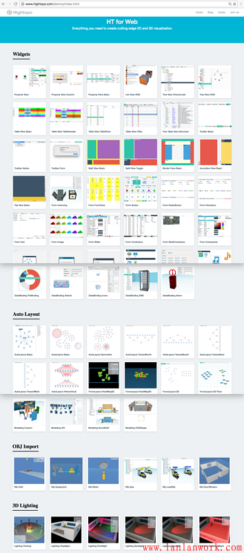 這樣綜合并可搜索的手冊(cè)入口居然還常被問(wèn)及 HT 的 Demo 在哪里?只能怪這些年深入人心的用戶體驗(yàn)理念,把人慣得包括很多程序員都如此之“懶”,當(dāng)然也怪我們沒(méi)把用戶體驗(yàn)的最后一公里做到位,于是最近 wangyinlong 同學(xué)人工例子抓圖,將數(shù)百個(gè)手冊(cè)例子進(jìn)行了歸類(lèi)整理,最終形成了方便大家直觀查找所有 HT 例子的頁(yè)面:http://www.hightopo.com/demos...