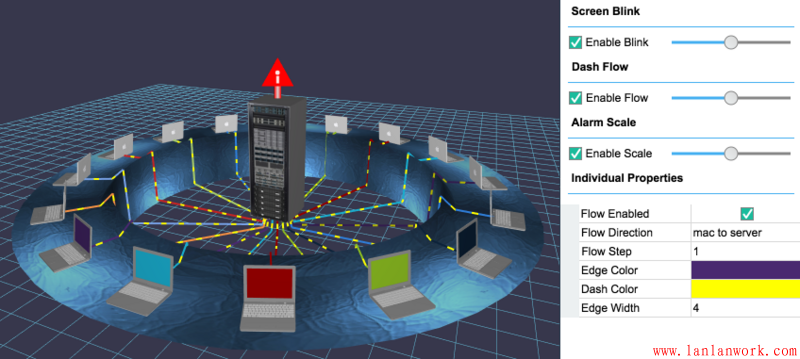 構(gòu)建出拓?fù)鋱D后很多人關(guān)系的是如何實(shí)現(xiàn)動(dòng)畫(huà),動(dòng)畫(huà)從本質(zhì)上來(lái)說(shuō)就是在一定的時(shí)間點(diǎn)上驅(qū)動(dòng)圖元的參數(shù)變化,例如大小、顏色、粗細(xì)包括可見(jiàn)不可見(jiàn)等來(lái)實(shí)現(xiàn)各種動(dòng)畫(huà)效果,而 HT 本來(lái)所有圖元都是數(shù)據(jù)驅(qū)動(dòng),用戶隨時(shí)可以修改 Data 上的任何屬性,因此隨便起個(gè)定時(shí)器 windwo.setInterval 不斷改變圖元屬性值即可實(shí)現(xiàn)動(dòng)畫(huà)效果,但為了方便客戶 HT 還提供了諸多方便函數(shù)和插件。