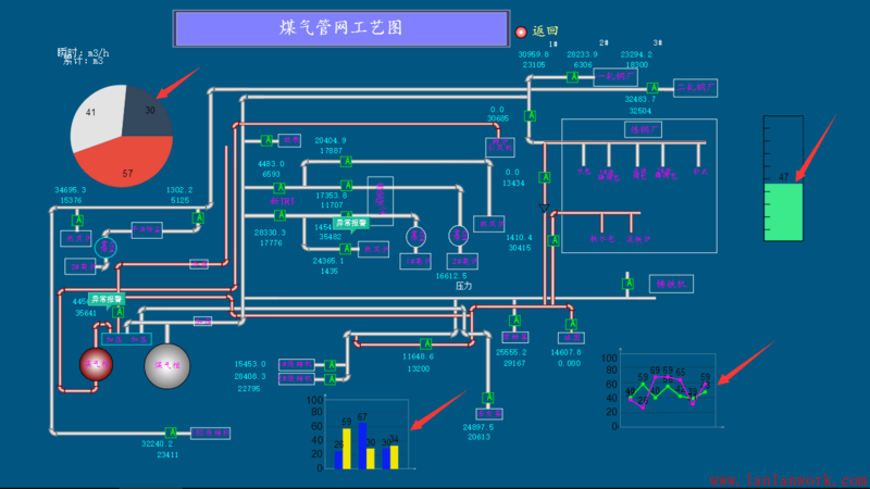 另外 HT 的矢量?jī)?nèi)置了 Chart 類(lèi)型,矢量?jī)?nèi)置的 Chart 不同于傳統(tǒng)獨(dú)立的 Chart 組件,傳統(tǒng)的 Chart 是獨(dú)立的視圖 DOM 組件,但 HT 的拓?fù)涫?Cavans 方式繪制,因此沒(méi)法實(shí)現(xiàn) Chart 組件和普通圖元的不同層次融合顯示,但矢量的 Chart 類(lèi)型倒是完美的實(shí)現(xiàn)了這樣的融合,很多工控應(yīng)用的客戶會(huì)將矢量 Chart 與拓?fù)鋱D元素融合一體,可參見(jiàn)《基于HT for Web的Web SCADA工控移動(dòng)應(yīng)用》http://www.hightopo.com/blog/... 一文中 HT 的 Web SCADA 應(yīng)用案例