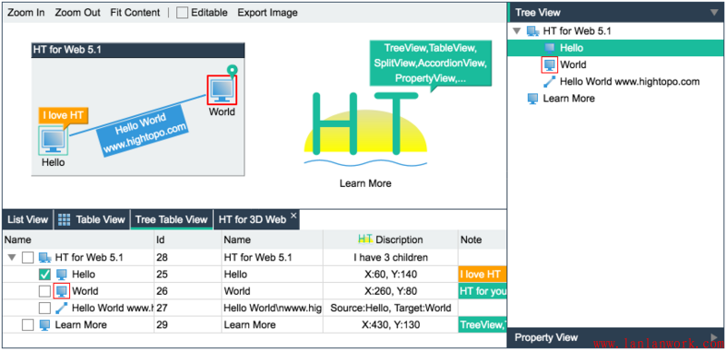 這個(gè)例子增加了設(shè)置父子關(guān)系的代碼,同時(shí)有更多的組件(拓?fù)鋱D、屬性頁(yè)、列表、樹(shù)、表格、樹(shù)表組件)綁定了同一個(gè)數(shù)據(jù)模型 DataModel,但用戶的代碼依然主要在 Data 和 DataModel 上的操作,這也是 HT 架構(gòu)設(shè)計(jì)的優(yōu)勢(shì),用戶使用更多組件并沒(méi)有增加新的學(xué)習(xí)成本,只要掌握的 DataModel 的基本操作,更多的組件也是如此。