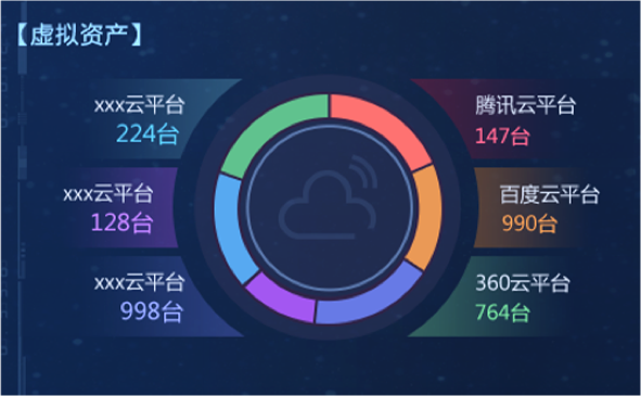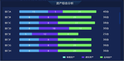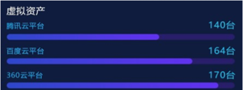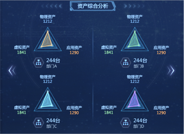 “資產(chǎn)綜合分析”模塊,以部門為單位,對企業(yè)“物理資產(chǎn)”“虛擬資產(chǎn)”“應(yīng)用資產(chǎn)”數(shù)量統(tǒng)計分析,并展示各部門內(nèi)不同資產(chǎn)類型的比例關(guān)系和總量。在設(shè)計版本中,我們改變模塊內(nèi)的布局和交互方式,以雷達(dá)圖方式展示部門內(nèi)部不同資產(chǎn)類型的數(shù)量關(guān)系和總量,并通過顏色來區(qū)分不同部間的數(shù)據(jù)。內(nèi)容擴(kuò)展性方面,采用左右橫向翻頁樣式,可自由設(shè)定系統(tǒng)自動翻頁切換和手動點擊切換,不僅豐富了頁面展示方式,又增加交互趣味性,數(shù)據(jù)切換過程中動效的使用也進(jìn)一步增加界面的科技感和“數(shù)據(jù)之美”。